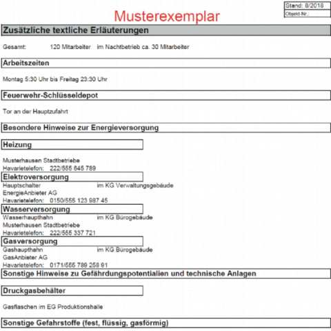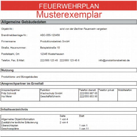 Wir erstellen Feuerwehrpläne nach DIN 14095 sowie die gesamte Palette der erforderlichen Einsatzdokumentationen bei Wahrung des Datenschutzes unter Zuhilfenahme modernster Grafiksoftware. Dadurch sind wir jederzeit in der Lage, die Pläne kurzfristig zu aktualisieren. Die Feuerwehrpläne werden zur besseren Übersicht mehrfarbig unter Verwendung der Symbole nach DIN 14034 erstellt. Die notwendigen Abstimmungen mit den für Ihr Objekt zuständigen Behörden bzw. Feuerwehren erfolgen auf Wunsch durch uns. Die Pläne werden im Einvernehmen mit den örtlichen Feuerwehren mit taktischen Objektinformationen kombiniert und in laminierter Ausführung im Format DIN A4 oder A3 erstellt. Feuerwehrpläne dienen der raschen Orientierung in einem Objekt oder einer baulichen Anlage sowie zur Beurteilung der Lage. Deshalb müssen sie stets auf dem aktuellen Stand sein. Feuerwehrpläne können zusätzlich auch Angaben für das taktische Vorgehen enthalten.